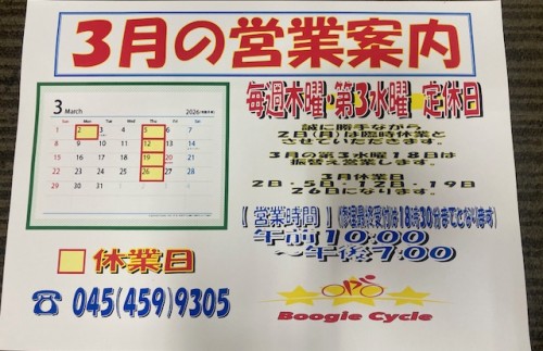 3月 営業案内2026年3年1日暖かい日が続き、ようやく寒さも峠を迎えた感じがしますね。早いもので3月に突入。春の新生活からご使用予定の自転車の購入から修理・整備まで、なんなりとお申し付けください。3月の営業案内です。誠に勝手ながら、2日(月)は都合により、臨時休業とさせていただきます。なお、3月は第3水曜の18日を振替え営業とします。ご来店の際は、営業日にお気をつけください。3月休業日2日・5日・12日・19日・26日
